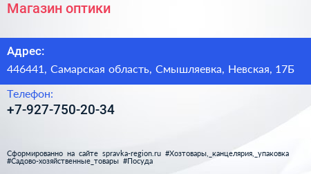 Магазин оптики по адресу 446441, Самарская область, Смышляевка, Невская, 17Б в дальнейшем Организация, размещена в следующих категориях: