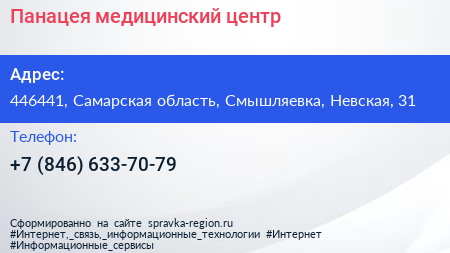 Панацея, медицинский центр по адресу 446441, Самарская область, Смышляевка, Невская, 31 в дальнейшем Организация, размещена в следующих категориях: