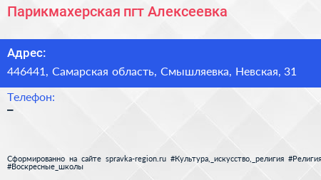 Парикмахерская, пгт. Алексеевка по адресу 446441, Самарская область, Смышляевка, Невская, 31 в дальнейшем Организация, размещена в следующих категориях: