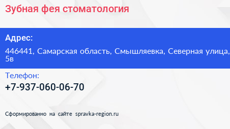 Зубная фея, стоматология по адресу 446441, Самарская область, Смышляевка, Северная улица, 5в в дальнейшем Организация, размещена в следующих категориях:
