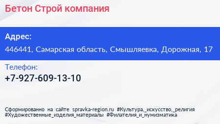 Бетон-Строй, компания по адресу 446441, Самарская область, Смышляевка, Дорожная, 17 в дальнейшем Организация, размещена в следующих категориях:
