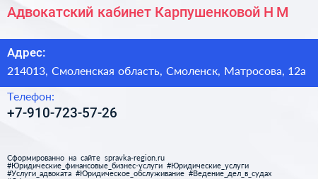 Адвокатский кабинет Карпушенковой Н. М. по адресу 214013, Смоленская область, Смоленск, Матросова, 12а в дальнейшем Организация, размещена в следующих категориях: