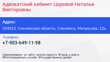 Адвокатский кабинет Царевой Натальи Викторовны по адресу 214013, Смоленская область, Смоленск, Матросова, 12а в дальнейшем Организация, размещена в следующих категориях: