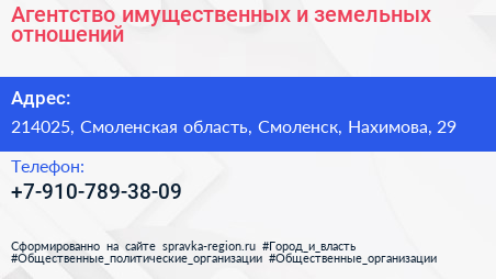 Агентство имущественных и земельных отношений по адресу 214025, Смоленская область, Смоленск, Нахимова, 29 в дальнейшем Организация, размещена в следующих категориях: