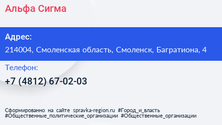 Альфа Сигма по адресу 214004, Смоленская область, Смоленск, Багратиона, 4 в дальнейшем Организация, размещена в следующих категориях: