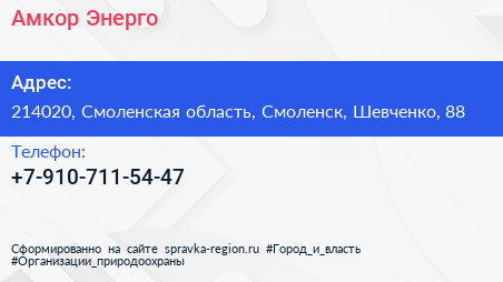 Амкор Энерго по адресу 214020, Смоленская область, Смоленск, Шевченко, 88 в дальнейшем Организация, размещена в следующих категориях: