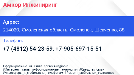 Амкор Инжиниринг по адресу 214020, Смоленская область, Смоленск, Шевченко, 88 в дальнейшем Организация, размещена в следующих категориях: