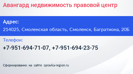 Авангард-недвижимость, правовой центр по адресу 214025, Смоленская область, Смоленск, Багратиона, 20Б в дальнейшем Организация, размещена в следующих категориях: