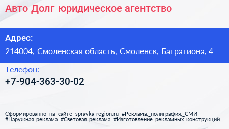 Авто Долг, юридическое агентство по адресу 214004, Смоленская область, Смоленск, Багратиона, 4 в дальнейшем Организация, размещена в следующих категориях: