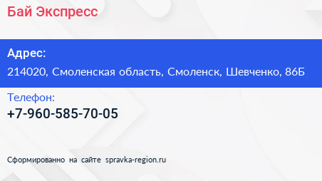 Бай Экспресс по адресу 214020, Смоленская область, Смоленск, Шевченко, 86Б в дальнейшем Организация, размещена в следующих категориях: