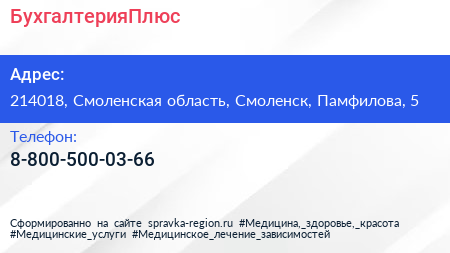 БухгалтерияПлюс по адресу 214018, Смоленская область, Смоленск, Памфилова, 5 в дальнейшем Организация, размещена в следующих категориях: