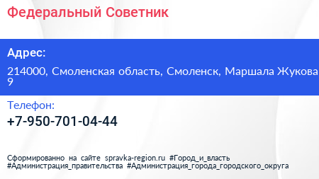 Федеральный Советник по адресу 214000, Смоленская область, Смоленск, Маршала Жукова, 9 в дальнейшем Организация, размещена в следующих категориях: