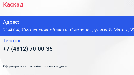 Каскад по адресу 214014, Смоленская область, Смоленск, улица 8 Марта, 20 в дальнейшем Организация, размещена в следующих категориях: