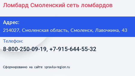 Ломбард Смоленский, сеть ломбардов по адресу 214027, Смоленская область, Смоленск, Лавочкина, 43 в дальнейшем Организация, размещена в следующих категориях: