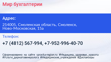 Мир бухгалтерии по адресу 214005, Смоленская область, Смоленск, Ново-Московская, 15а в дальнейшем Организация, размещена в следующих категориях: