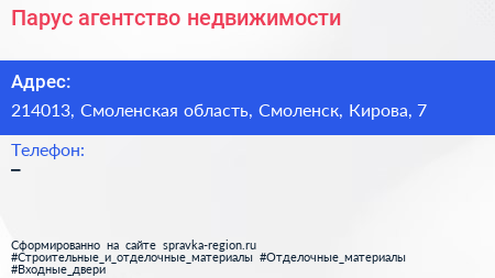 Парус, агентство недвижимости по адресу 214013, Смоленская область, Смоленск, Кирова, 7 в дальнейшем Организация, размещена в следующих категориях: