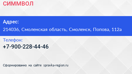 СИММВОЛ по адресу 214036, Смоленская область, Смоленск, Попова, 112а в дальнейшем Организация, размещена в следующих категориях: