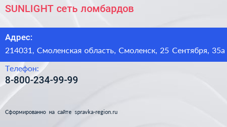 SUNLIGHT, сеть ломбардов по адресу 214031, Смоленская область, Смоленск, 25 Сентября, 35а в дальнейшем Организация, размещена в следующих категориях: