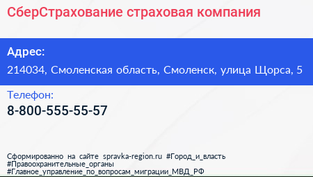 СберСтрахование, страховая компания по адресу 214034, Смоленская область, Смоленск, улица Щорса, 5 в дальнейшем Организация, размещена в следующих категориях: