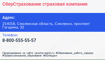 СберСтрахование, страховая компания по адресу 214018, Смоленская область, Смоленск, проспект Гагарина, 32 в дальнейшем Организация, размещена в следующих категориях: