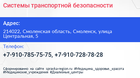 Системы транспортной безопасности по адресу 214022, Смоленская область, Смоленск, улица Центральная, 5 в дальнейшем Организация, размещена в следующих категориях: