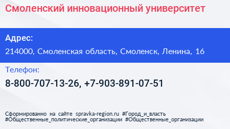Смоленский инновационный университет по адресу 214000, Смоленская область, Смоленск, Ленина, 16 в дальнейшем Организация, размещена в следующих категориях:
