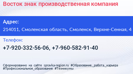 Восток-знак, производственная компания по адресу 214011, Смоленская область, Смоленск, Верхне-Сенная, 4 в дальнейшем Организация, размещена в следующих категориях: