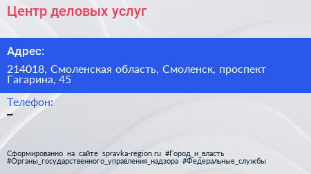 Центр деловых услуг по адресу 214018, Смоленская область, Смоленск, проспект Гагарина, 45 в дальнейшем Организация, размещена в следующих категориях: