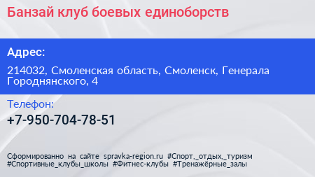 Банзай, клуб боевых единоборств по адресу 214032, Смоленская область, Смоленск, Генерала Городнянского, 4 в дальнейшем Организация, размещена в следующих категориях: