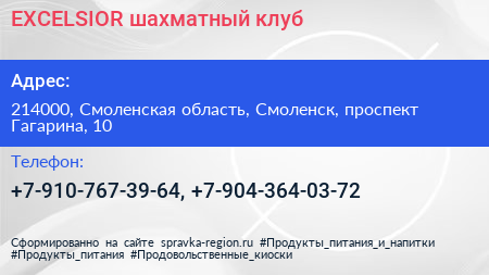 EXCELSIOR, шахматный клуб по адресу 214000, Смоленская область, Смоленск, проспект Гагарина, 10 в дальнейшем Организация, размещена в следующих категориях: