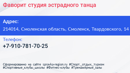 Фаворит, студия эстрадного танца по адресу 214014, Смоленская область, Смоленск, Твардовского, 14 в дальнейшем Организация, размещена в следующих категориях: