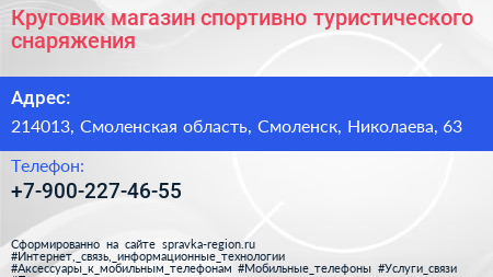 Круговик, магазин спортивно-туристического снаряжения по адресу 214013, Смоленская область, Смоленск, Николаева, 63 в дальнейшем Организация, размещена в следующих категориях: