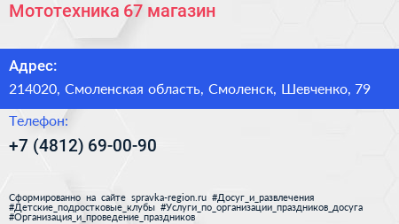 Мототехника 67, магазин по адресу 214020, Смоленская область, Смоленск, Шевченко, 79 в дальнейшем Организация, размещена в следующих категориях: