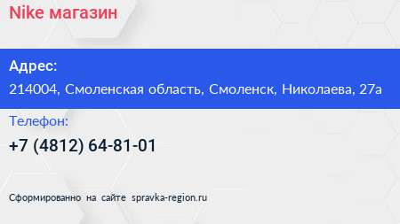 Nike, магазин по адресу 214004, Смоленская область, Смоленск, Николаева, 27а в дальнейшем Организация, размещена в следующих категориях: