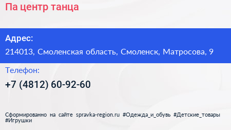 Па, центр танца по адресу 214013, Смоленская область, Смоленск, Матросова, 9 в дальнейшем Организация, размещена в следующих категориях: