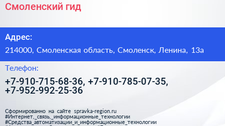 Смоленский гид по адресу 214000, Смоленская область, Смоленск, Ленина, 13а в дальнейшем Организация, размещена в следующих категориях: