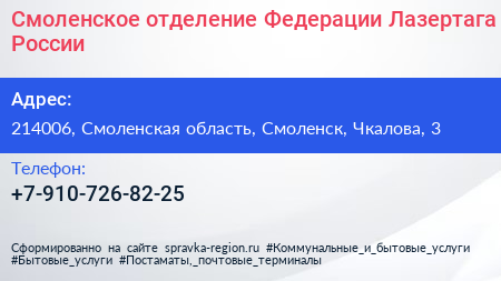 Смоленское отделение Федерации Лазертага России по адресу 214006, Смоленская область, Смоленск, Чкалова, 3 в дальнейшем Организация, размещена в следующих категориях: