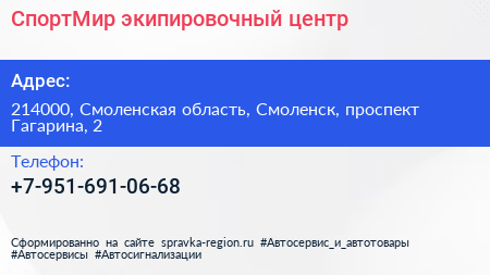 СпортМир, экипировочный центр по адресу 214000, Смоленская область, Смоленск, проспект Гагарина, 2 в дальнейшем Организация, размещена в следующих категориях: