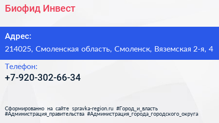 Биофид Инвест по адресу 214025, Смоленская область, Смоленск, Вяземская 2-я, 4 в дальнейшем Организация, размещена в следующих категориях: