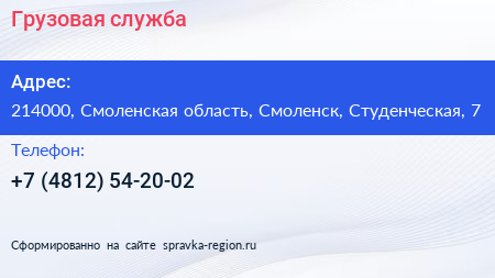Грузовая служба по адресу 214000, Смоленская область, Смоленск, Студенческая, 7 в дальнейшем Организация, размещена в следующих категориях: