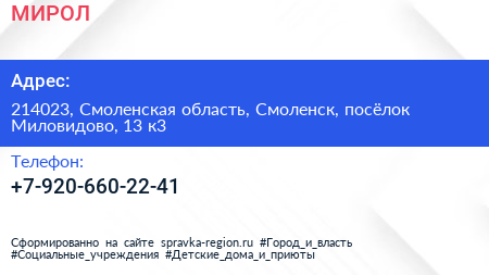 МИРОЛ по адресу 214023, Смоленская область, Смоленск, посёлок Миловидово, 13 к3 в дальнейшем Организация, размещена в следующих категориях: