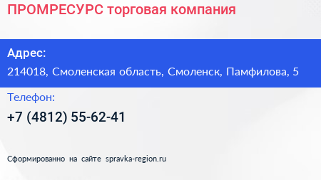 ПРОМРЕСУРС, торговая компания по адресу 214018, Смоленская область, Смоленск, Памфилова, 5 в дальнейшем Организация, размещена в следующих категориях: