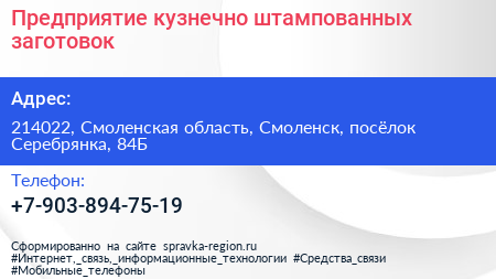 Предприятие кузнечно-штампованных заготовок по адресу 214022, Смоленская область, Смоленск, посёлок Серебрянка, 84Б в дальнейшем Организация, размещена в следующих категориях: