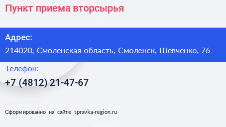 Пункт приема вторсырья по адресу 214020, Смоленская область, Смоленск, Шевченко, 76 в дальнейшем Организация, размещена в следующих категориях: