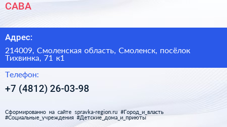 САВА по адресу 214009, Смоленская область, Смоленск, посёлок Тихвинка, 71 к1 в дальнейшем Организация, размещена в следующих категориях: