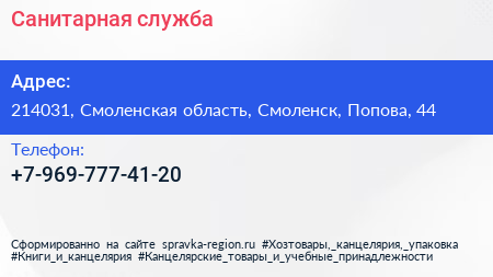Санитарная служба по адресу 214031, Смоленская область, Смоленск, Попова, 44 в дальнейшем Организация, размещена в следующих категориях: