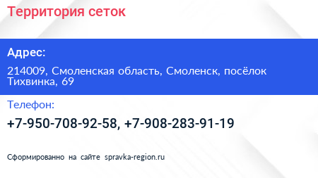 Территория сеток по адресу 214009, Смоленская область, Смоленск, посёлок Тихвинка, 69 в дальнейшем Организация, размещена в следующих категориях: