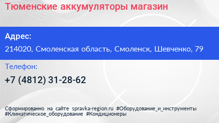 Тюменские аккумуляторы, магазин по адресу 214020, Смоленская область, Смоленск, Шевченко, 79 в дальнейшем Организация, размещена в следующих категориях: