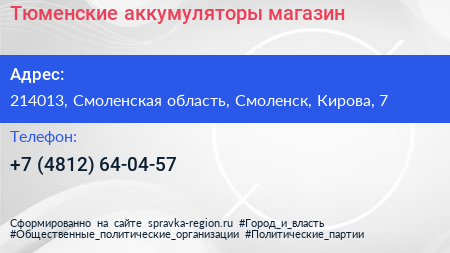 Тюменские аккумуляторы, магазин по адресу 214013, Смоленская область, Смоленск, Кирова, 7 в дальнейшем Организация, размещена в следующих категориях: