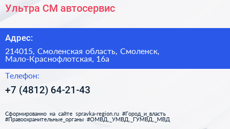 Ультра СМ, автосервис по адресу 214015, Смоленская область, Смоленск, Мало-Краснофлотская, 16а в дальнейшем Организация, размещена в следующих категориях: